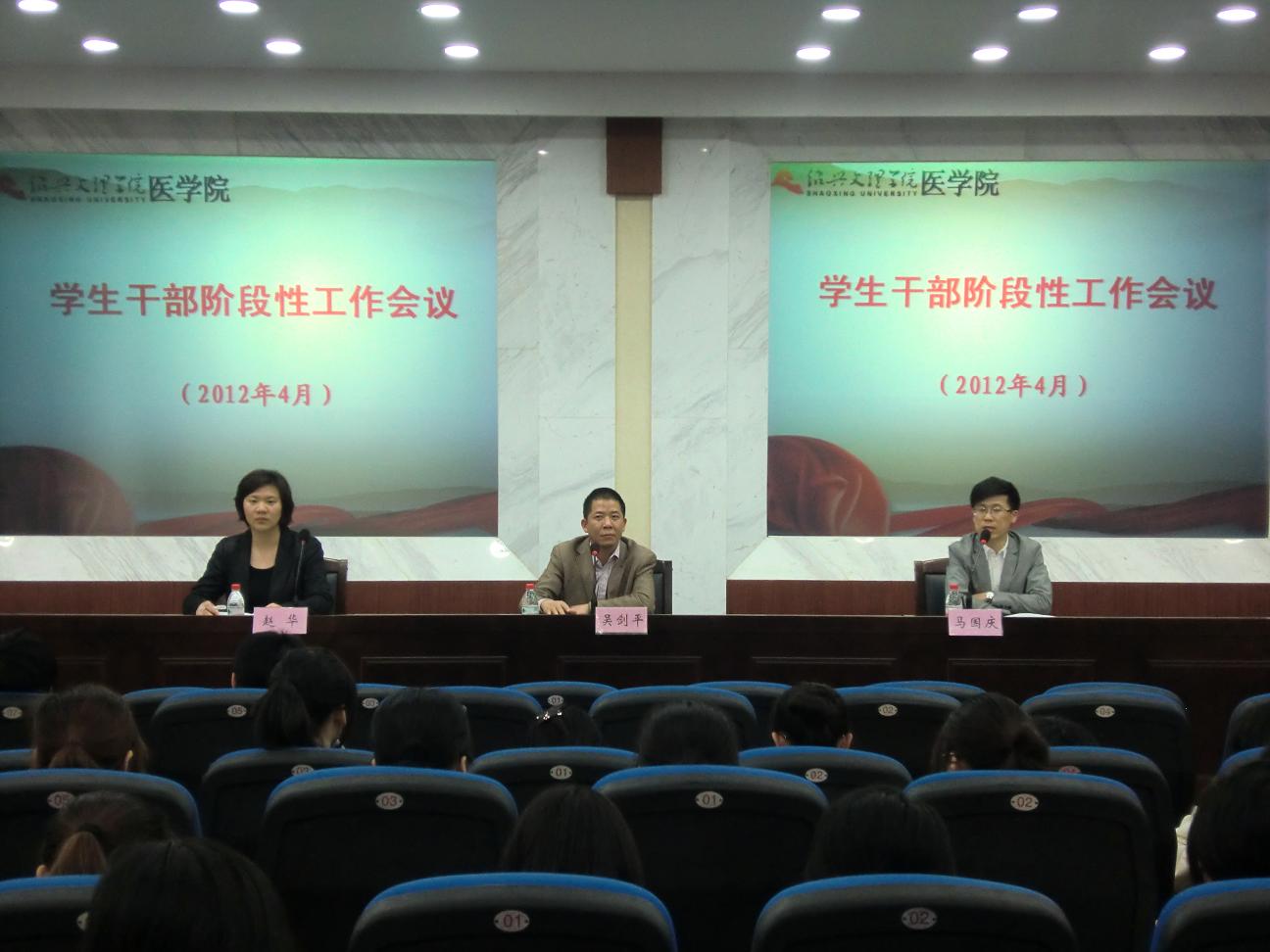 4月18日下午,我院在财贞楼二楼学术厅举行2011学年第2学期学生工作阶段性会议,总结前一阶段工作部署近期工作,重点推介2011年度优良学风班和先进班集体管理经验。院党委副书记吴剑平出席会议。学生科全体辅导员、团委、学生会部长级学生干部,各班班长、团支书、副班长,辅导员助理以及党员督察队全体成员参加了会议。学生科副科长马国庆主持会议。