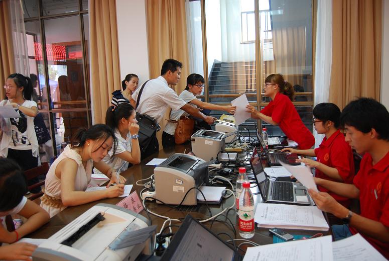 早上6:30,学院行政楼前新生入学注册报到现场已是一片繁忙的景象,学院各部门、各系部的工作人员和志愿者、学生干部早已来到迎新现场。大家简单的集合之后,满怀激情的开始静候报到同学的到来。记者看到,今年的报到和往年比较,多了一个环节:电子报到注册。而学院也早已提前选取优秀的学生干部,对他们进行培训,不只是注册操作方法,更重要的要体现我院良好的精神风貌和迎新热情。学院领导也是早早的来到报到现场,了解迎新准备情况。在南山校区门口、在新生电子注册室、在学生公寓广场、在新生报到处都可以看到开云最新官方的身影,所有的一切,只为能够让入学的新生们感受到开云最新官方大家庭的温暖和关爱。而我们已经准备好了!