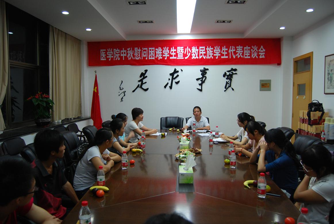 9月8日晚6:30,学院在319会议室举办中秋慰问困难学生暨少数民族学生代表座谈会。院党委副书记吴剑平、学生科副科长马国庆、团委书记赵华与少数民族学生代表共20余人参加会议。座谈会由资困助学辅导员胡晓琳主持。