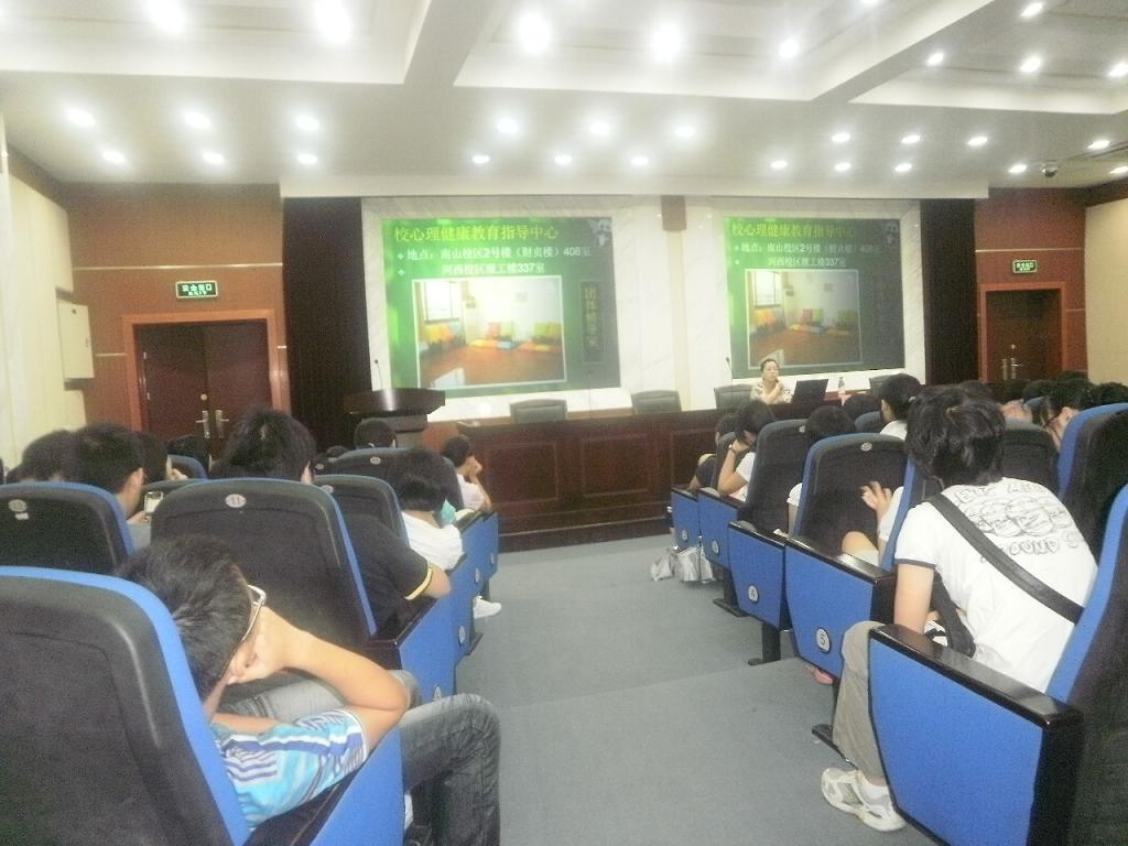 周贤老师首先通过“健康灰色区”和同学们进行了互动,从而引出了“新生心理适应”这个主题。然后通过一系列的幻灯片,清晰明了地阐释了心理问题的分类、健康的心理素质和新生常见心态等一些问题。讲座现场座无虚席,整个过程中老师讲得精彩,同学们听得认真。周贤老师幽默诙谐的演讲风格引来了在场同学的阵阵笑声和掌声。