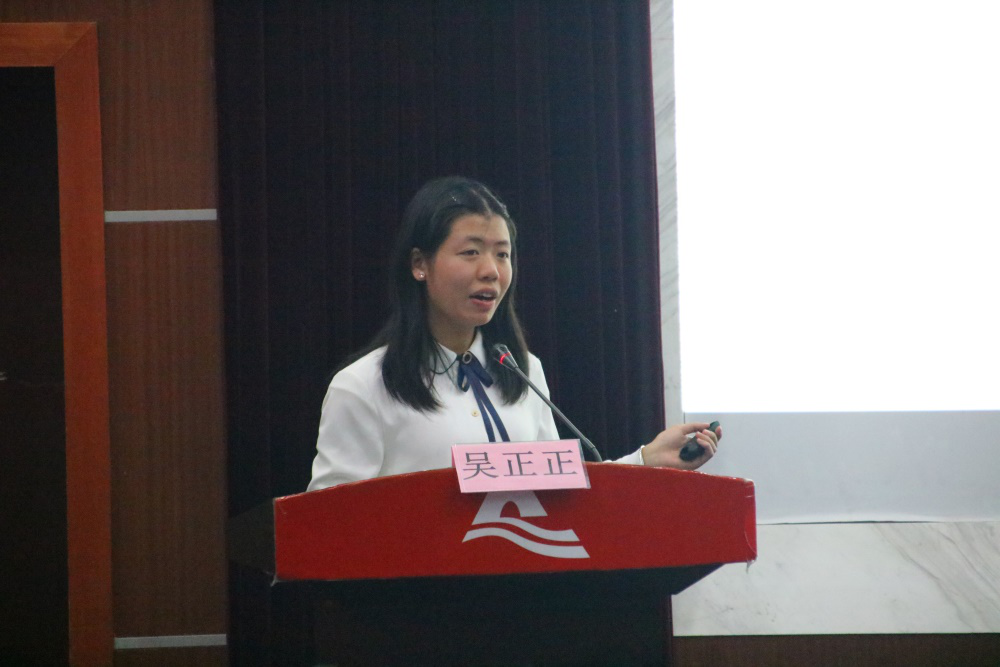 首先邀请了吴正正同学向在座的各位介绍了她所在的团队正在主持发展的项目——布鲁斯科技:柴油车尾气处理催化剂的领航者。吴正正同学从项目背景、解决办法、市场容量、市场通电、产品介绍、竞争优势、团队介绍、商业模式、投资财务、发展规划及未来愿景11个方面阐述项目内容。布鲁斯科技致力向市场痛点,外企垄断发出冲击,用以填补市场空白,寻找新型柴油催化剂。吴正正像同学们阐述了该项目的宗旨——重研究、轻资产、大客户,并指出产品已由布鲁斯一代、二代完成质的飞越,到达布鲁斯三代,使得尾气处理变得无污染,产品使用年限大幅增加,也因此成功申请了两项国家专利。在此基础上,他们团队将继续不断发展规划,完善并发展。