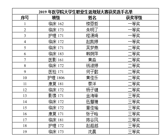 经过评委紧锣密鼓地评分后,临床医学162班楼恩哲、临床医学173班朱明了、护理学171班程潇琦、临床医学172班赵凯婷4位同学获得一等奖,临床医学171班吴梦燕等8位同学获得二等奖,医学影像技术171班金海锋等7位同学获得三等奖。