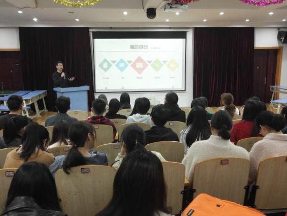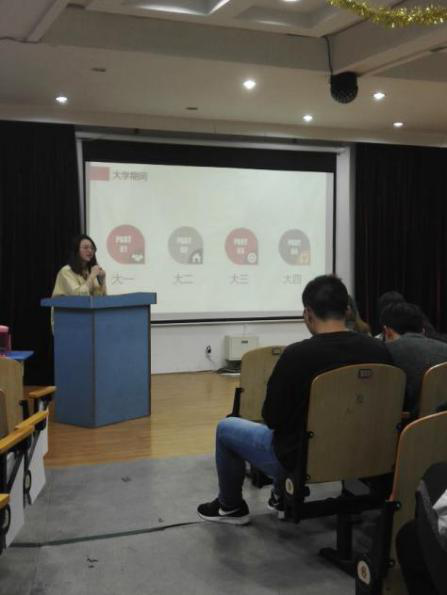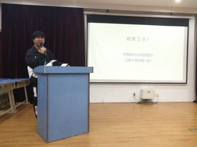 紧接着校第九届职业生涯规划大赛一等奖获得者、学生会副主席楼恩哲同学向大家提出一些问题:我们为什么要做职业规划?我们该何去何从?针对上述两个问题,学长就自己的亲身经历以及自我感悟向在座的听众分析了当今医学生毕业后的选择,如考研、工作等,提出在座的每一个人都应该认识到自己的未来发展方向,并联系当下,每一个人的选择都需要联系自己的生活、专业以及兴趣方向,是毕业后就工作,还是继续学习。