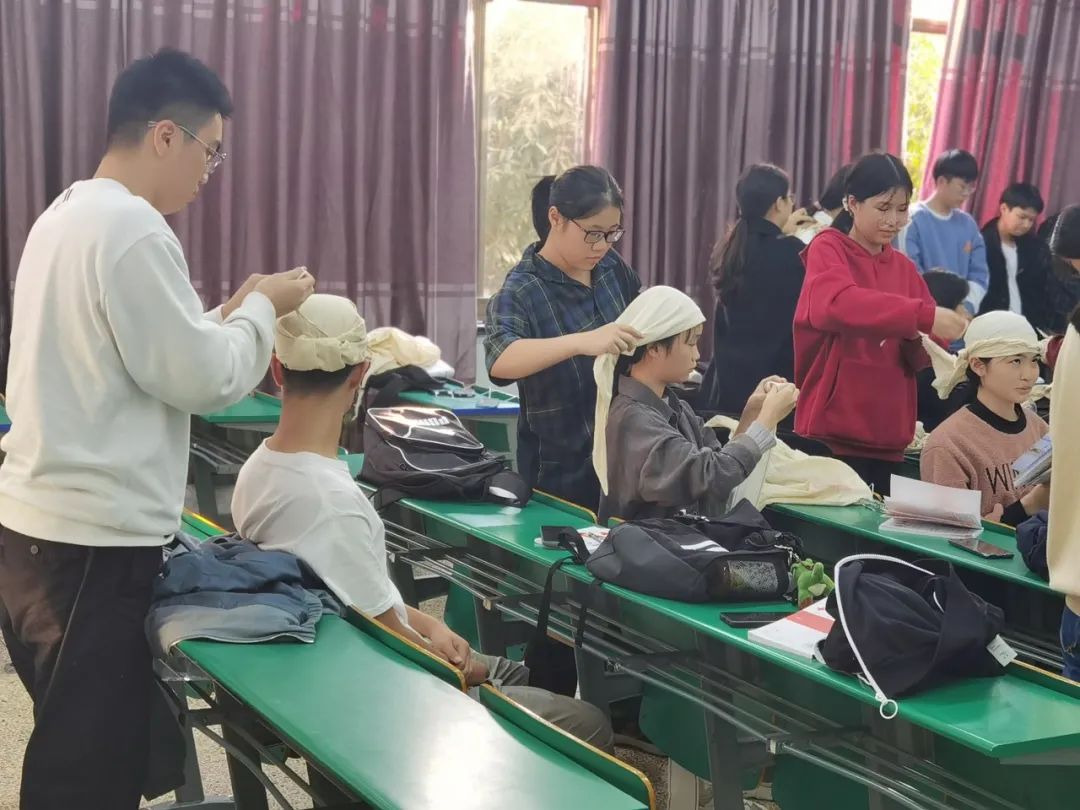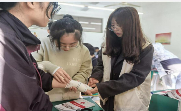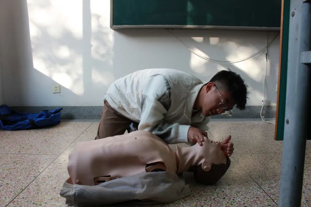 实操训练中,爱之翼的干部们先进行了心肺复苏术、创伤救护四项技能等操作演示,学员们认真听讲,并在小老师的指导下积极地进行了练习。