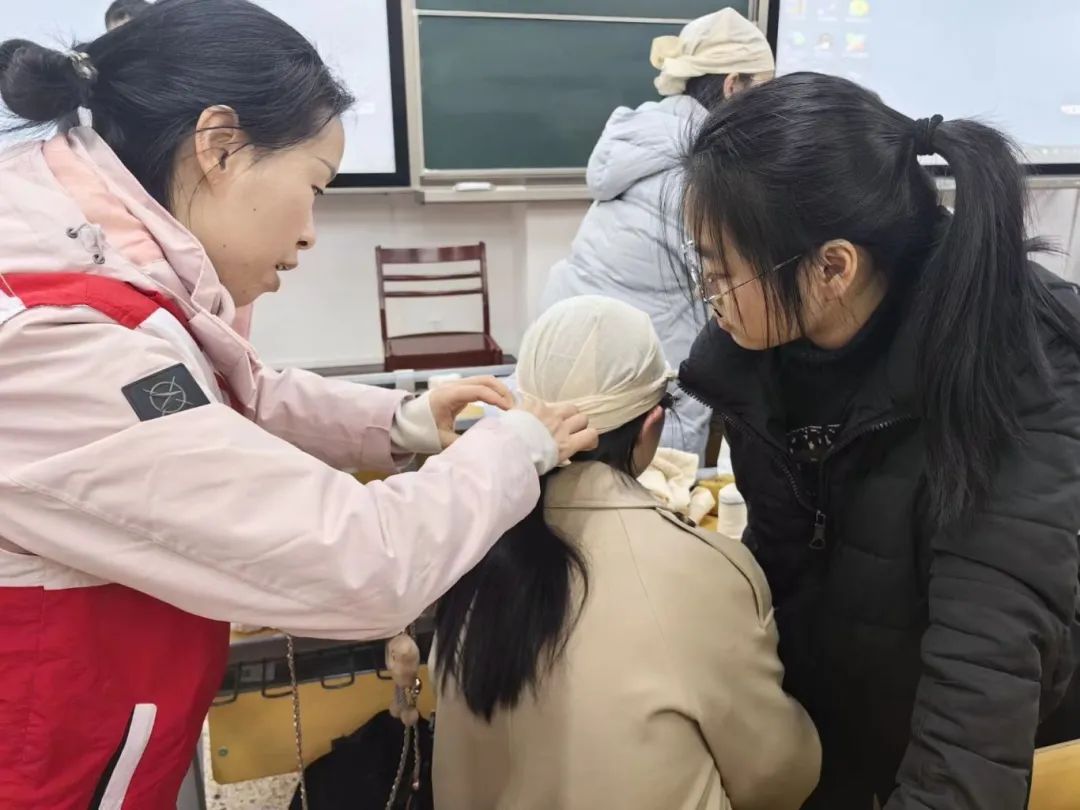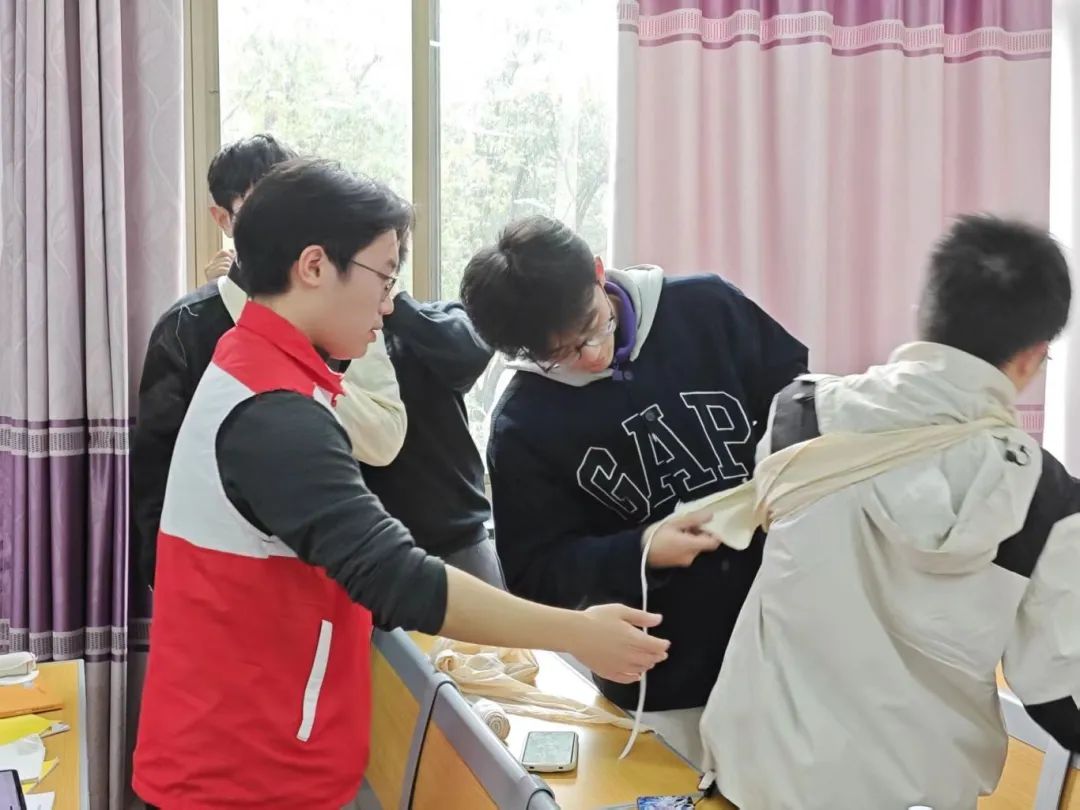 培训现场,师资团队精心挑选了手背出血、头部出血、前臂骨折、锁骨骨折等典型创伤,演示并指导相对应的急救措施。同学们学习态度认真,分组反复模拟各类急救操作。老师们全程耐心指导,精准指出同学们操作中的错误,并帮助其改正不足的地方,帮助学员掌握创伤救护的技能。