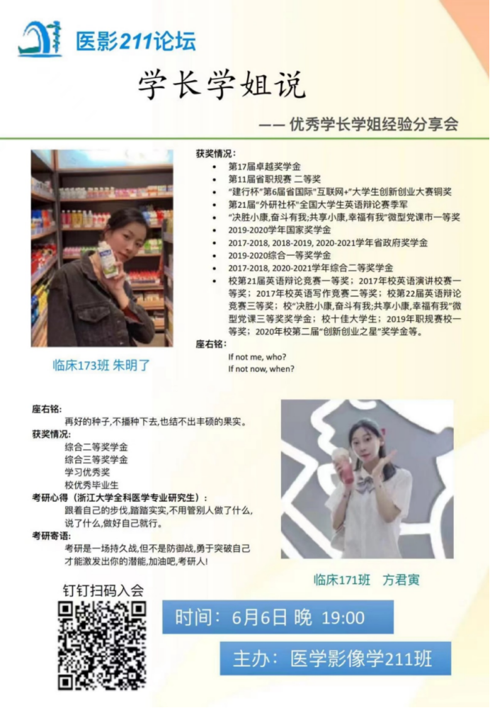 为激发和调动同学们的考研热情,加强同学们对考研相关内容的了解,以及为大家的考研提供参考与指明方向,特此医影211班于2022年6月6日晚七点在钉钉线上平台举行考研分享会议。本次会议,朱明了和方君寅两位学姐受邀担任经验分享者,医影211班全体同学以及对此活动有兴趣的其他同学作为观众参与会议,医影211班班长邱佳玲与班主任主持此次会议。