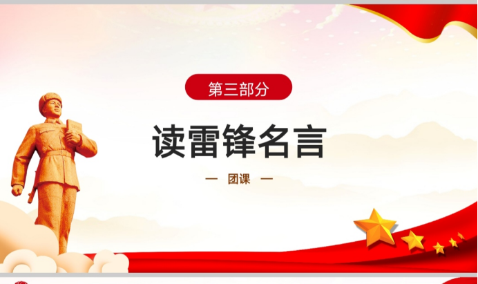 第三部分为读雷锋名言,例如“力量从团结来,智慧从劳动来,行动从思想来,荣誉从集体来” “人的生命是有限的,可是为人民服务是无限的。我要把有限的生命投入到无限的为人民服务当中去” “不经风雨,长不成大树;不受百炼,难以成钢”等等。