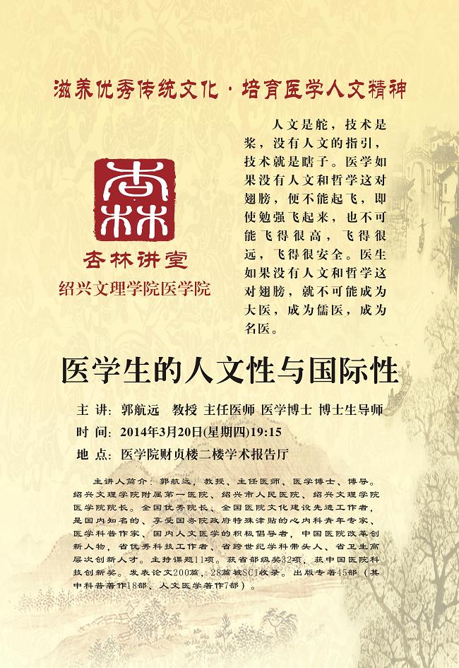 郭航远,教授、主任医师、医学博士、博导。绍兴文理学院附属第一医院、绍兴市人民医院、绍兴文理学院开云最新官方院长。全国优秀院长、全国医院文化建设先进工作者,是国内知名的、享受国务院政府特殊津贴的心内科青年专家、医学科普作家、国内人文医学的积极倡导者,中国医院改革创新人物,省优秀科技工作者、省跨世纪学科带头人、省卫生高层次创新人才。主持课题11项。获省部级奖16项,获中国医院科技创新奖。发表论文200篇,28篇被SCI收录。出版专著45部(其中科普著作18部、人文医学著作7部)。