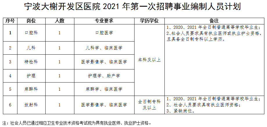 宁波大榭开发区医院第一次招聘事业编制工作人员6人