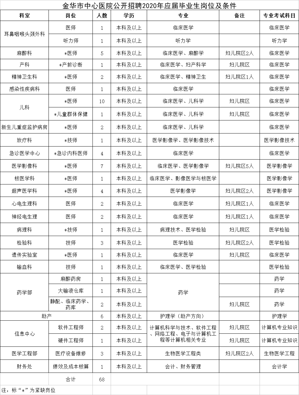 因业务发展需要,现面向2020年全日制普通高校本科及以上应届毕业生招聘68名工作人员,工作岗位将根据工作需要在总院和妇儿院区进行人员调配。医院招聘岗位身份为报备员额,按照事业单位人事管理制度管理。有关事项公告如下:
