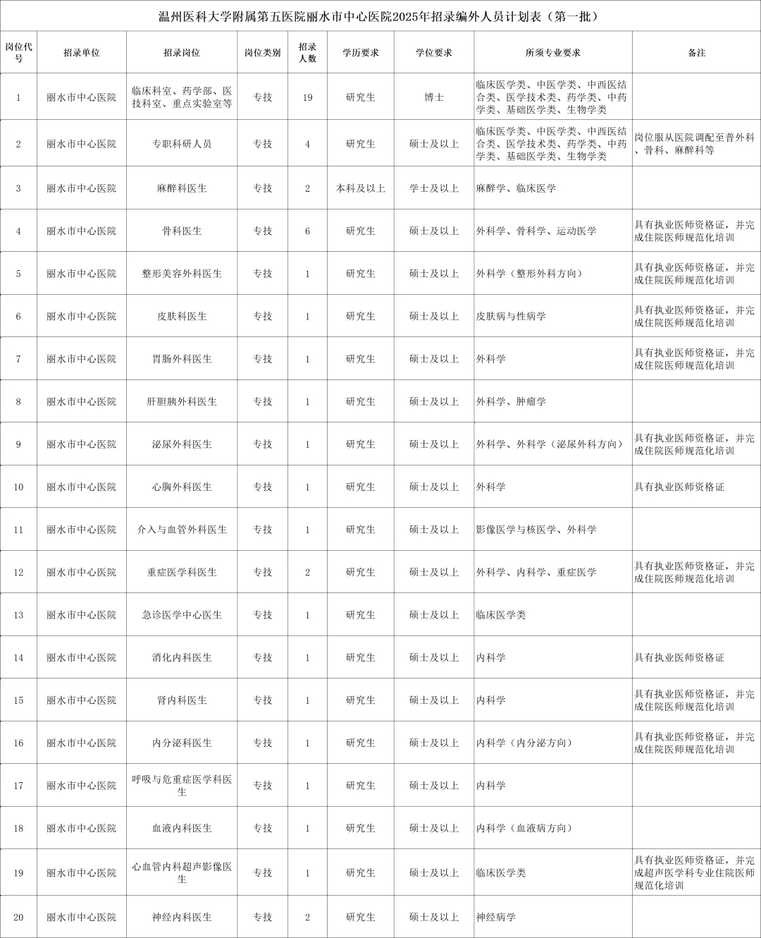本批次招录需求为40个岗位共103人。岗位名称、招录人数及具体要求见《温州医科大学附属第五医院丽水市中心医院2025年招录编外人员计划表(第一批)》(附件1)。