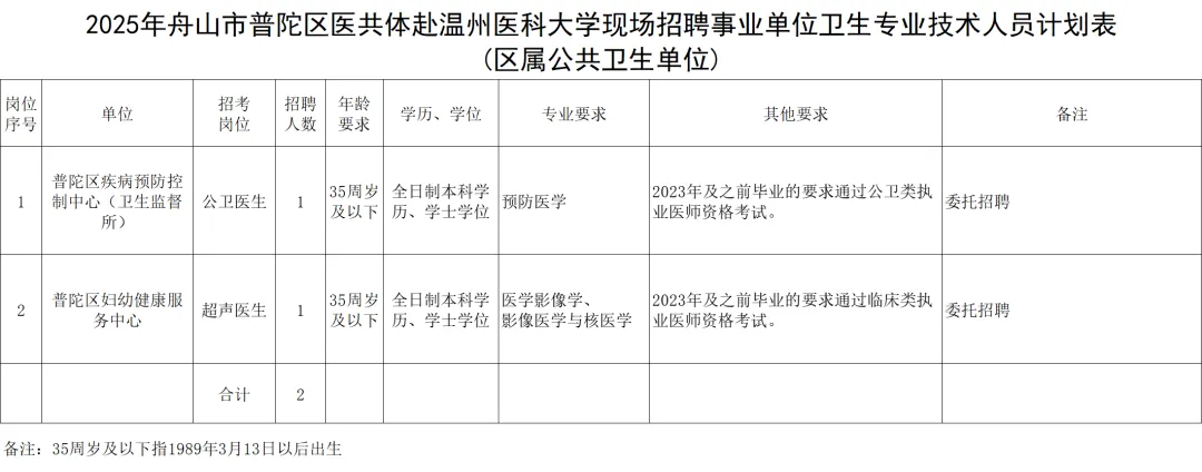 计划招聘医务人员30名,其中普陀区医共体牵头单位普陀医院22名、普陀区医共体成员单位普陀医院六横分院6名、普陀区疾病预防控制中心(卫生监督所)委托招聘1名、普陀区妇幼健康服务中心委托招聘1名,具体招聘岗位及计划数详见《2025年舟山市普陀区医共体赴温州医科大学现场招聘事业单位卫生专业技术人员计划表》(附件1,其中医共体普陀医院和六横分院招聘岗位见附件1-1、区疾病预防控制中心(卫生监督所)和区妇幼健康服务中心委托招聘岗位见附件1-2)。