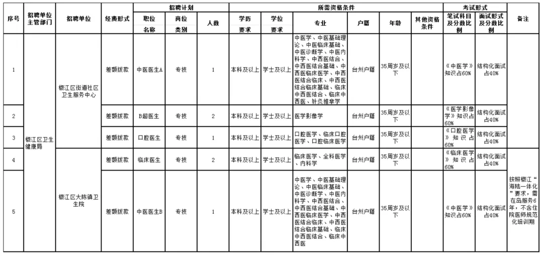 5.具备与招聘岗位要求相适应的学历(学位)、专业、任职资格、职业(执业)资格及技能等条件,以《2025年椒江区卫健系统事业单位公开招聘卫生类工作人员职位一览表》为准,其中有学位要求的岗位,学位须与所要求的学历相对应。