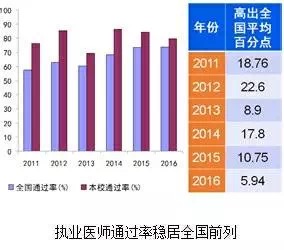 (3)执业医师通过率高连续六届毕业生国家执业医师考试通过率远高出全国平均水平,在省内同类院校中名列前茅。