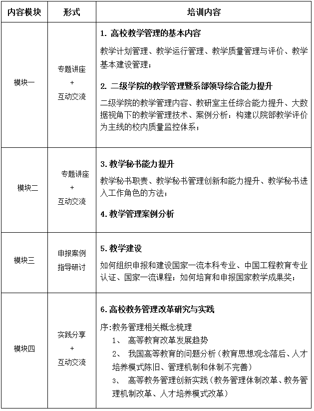 在教育改革大背景下,为加强教学管理队伍建设,提高教学管理人员的综合素质和业务能力,提升教学管理能力和水平更好地履行岗位职责。打造一支职业素养高、业务能力强的教学管理人员及教学秘书队伍,服务高校教学管理和高等教育教学改革与发展的需要。经研究,我单位决定举办“高校教务管理创新暨教学管理人员与教学秘书业务技能提升研修班”。现将相关事宜函告如下,望各院校积极支持和配合,组织相关教师参加。