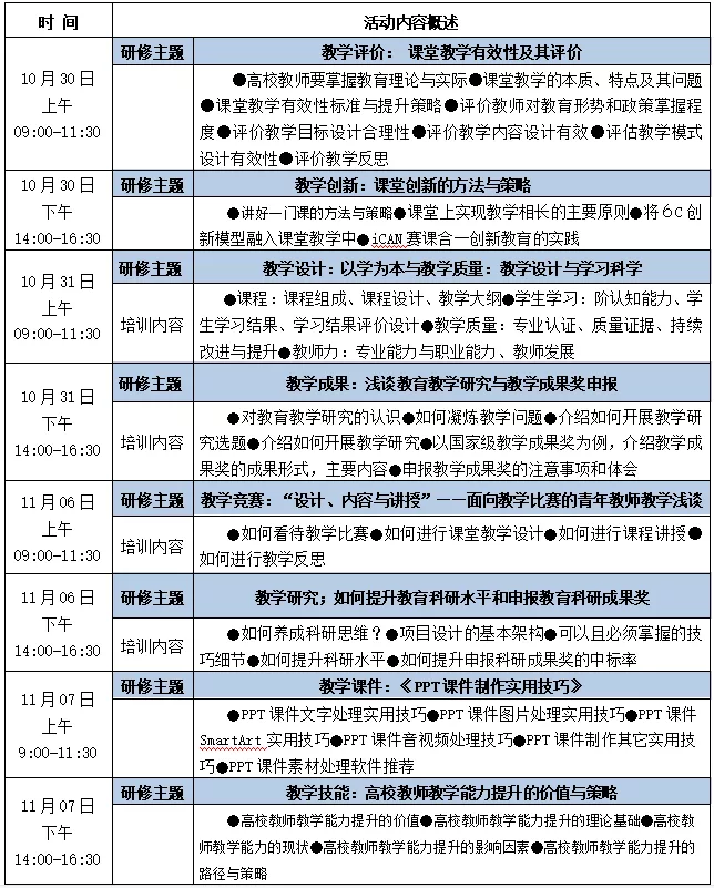 然而,高校骨干教师作为高校学科建设中重要的执行者,是学校发展的重要动力,是教学活动的主导者,是人才培养质量的保证,其素质与能力影响着高校建设的整体水平。因而,高校骨干教师的培养不仅仅是高校师资队伍建设的一个重要部分,更是提升高校综合办学水平的必经之路。为此,我单位特于2021年10月30日--31日,2021年11月06日--07日在线举办《全国高等院校骨干教师教学能力提升与教学创新系列研修班》为各高校骨干教师量身打造的系列专属课程。