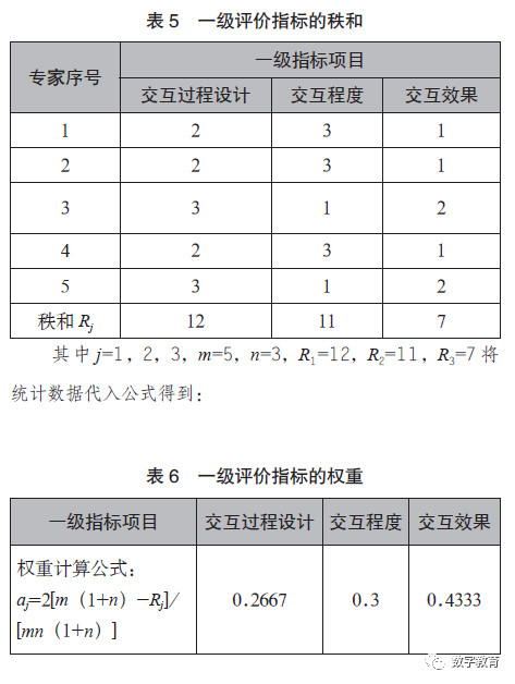 筛选指标后,利用专家排序法来确定各指标的权重。将筛选后的指标制成排序意见表,发放给五位专家,他们分别是来自北京师范大学、哈尔滨师范大学、江西师范大学的副教授,另外发放给五位来自中小学的一线教师,意见表回收率100%。团队对五位专家的意见进行统计并计算每个指标的权重。