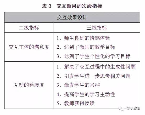 交互主体的满意度关注预设的目标是否达成,使用“满意”二字就包括了交互主体是否在交互过程中产生了良好的情感体验,通过交互能否达到交互主体的教学目标和学习目标。互动的延展度则是强调交互过程中生成的其他结果,主体是主动进行意义建构的,经过交互可能会产生一些预料之外的效果,因此可以将这些效果作为其三级指标,它包括:是否解决交互过程中非预设的问题,是否引起了学生对相关问题的思考,学生对该学科、该堂课或该内容的兴趣是否提高,通过交互过程教师是否充分了解学生的学习情况等。通过对交互效果的分析,本文得出这一维度的指标,如表3 所示。