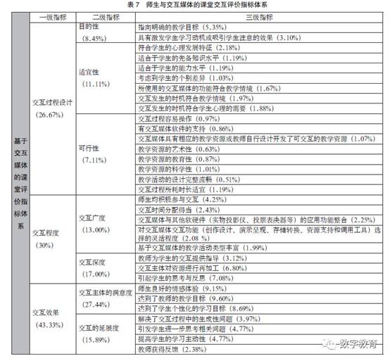 经过初步拟定指标、筛选指标和确定指标权重三个过程,最终得到基于交互媒体的课堂交互评价指标体系如表7,其中,括号中所示数值为对应指标的权重。