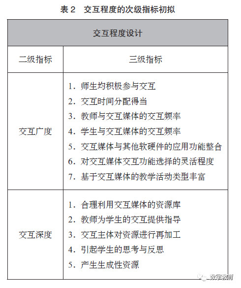 交互过程重在设计方案的实施质量,因此着重需要关注的就是交互的程度。在课堂中利用交互媒体促进多元深层互动,其中的多元可以理解为交互广度,而深层则可以理解为交互深度。于庆军[21]、魏志慧[22]等分别进行过课堂教学交互研究和网络课程教学交互研究,以交互程度作为评价过程中的重要指标,主要分为两个部分:交互广度和交互深度,但是他们更多关注的是参与主体这个要素,在这里,我们将这个范围拓展,涉及课堂教学环境中的多个要素,并将交互广度与交互深度作为二级指标。