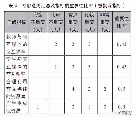 计算每级指标下非常重要”“比较重要两档人数比例总和,再计算完全不重要”“比较不重要”“有点重要”“比较重要”“非常重要五档人数比例总和, 两者相除即可得到每一级指标的重要性比率。对每个指标的判断结果进行统计,由低到高排列,将低于或等于0.5 的指标剔除,并根据专家的意见对指标进行归类、合并和排序,得到筛选后的指标。依据统计结果剔除的指标情况如表4 所示,其中,教师与交互媒体的交互频率”“学生与交互媒体的交互频率重要性比率均低于0.5,查看专家的具体解释,他们表示这两个指标缺乏可以评价的标准,并且难以测量,因此将这二者删去。合理利用交互媒体的资源库产生生成性资源的重要性比率等于0.5,专家认为在与交互媒体交互的过程中达到教学目标才是最重要的,至于是否对交互媒体的资源库进行合理利用,或是否产生生成性资源都不太重要,因此我们将这两个指标也删去。