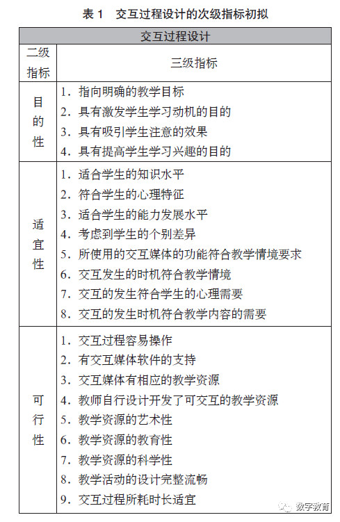 从已有研究来看,赵小云[15]对课堂教学设计的评价内容、标准和工具进行研究,根据课堂教学设计的产生过程,她认为评价内容应该分为教学设计的准备评价、过程评价和结果评价。而交互设计属于教学设计的一部分,也应该从前期设计与准备、过程实施和分析结果三个方面入手,在后面的分析中也可以将教学设计的过程与评价作为参考。于庆军[16]通过文献、调查等方法构建了地理课堂教学中师生互动的评价指标体系,分为师生互动方式的应用、师生互动主体的参与度和师生互动的效果三个维度,其研究主要关注的是师生之间的互动,在互动过程中,他主要对互动主体的参与度进行了评价,包括参与广度与深度。