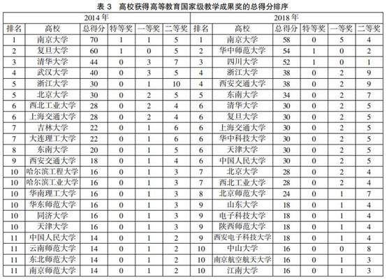 2014年南京大学、复旦大学、清华大学的获奖项目总得分名列前三甲。其次是武汉大学、浙江大学、北京大学。2018年南京大学获奖项目总得分再次摘得桂冠,华中师范大学、四川大学以荣获特等奖的显著优势紧随其后。上海交通大学、中国人民大学、北京师范大学、东南大学等高水平大学近两届获奖项目总得分的排名均比较靠前。相比之下,中央民族大学、云南大学等高水平大学的教学改革力度则有待提升。2014年中央民族大学未获得高等教育国家级教学成果奖,2018年中央民族大学、云南大学均未获奖。