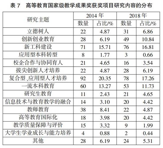 从研究内容看,近两届获奖项目的研究主题主要集中在立德树人,创新创业教育,新工科建设,应用型本科转型,校企合作与协同育人,拔尖创新人才培养,复合型、应用型人才培养,一流本科教育,研究生教育,信息技术与教育教学的融合,教师教育,高等教育国际化,教学质量保障与评价,大学生学业成长与能力培养等14个领域。这些研究主题与党和国家近年来在高等教育领域大力推行的政策举措和主张高度一致,如为主动应对新一轮科技革命与产业变革,支撑服务创新驱动发展、“中国制造2025”等一系列国家战略,教育部大力支持新工科建设;习近平总书记在全国高校思想政治教育工作会议上将“立德树人”确立为高校的立身之本;为推动“大众创业、万众创新”,国务院办公厅印发《关于深化高等学校创新创业教育改革的实施意见》,对高校开展“双创”教育提出一系列要求。这充分表明国家教育政策对我国高校教学改革具有重大的导向作用。近两届获奖项目研究内容的具体分布如表7所示。