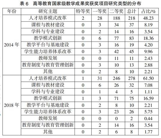 高等教育国家级教学成果奖获奖项目的研究主题在很大程度上代表或反映我国高等教育教学改革的主要内容和前沿成果。笔者从研究类型、研究内容两个维度对近两届获奖项目的研究主题进行分析。从研究类型看,大致可分为:人才培养模式改革、课程与教材改革、学科与专业建设、教学模式创新、教学平台与基地建设、学生能力培养体系改革、教师发展、教育制度与教育管理的创新7个主题。各类项目的数量分布如表6所示。