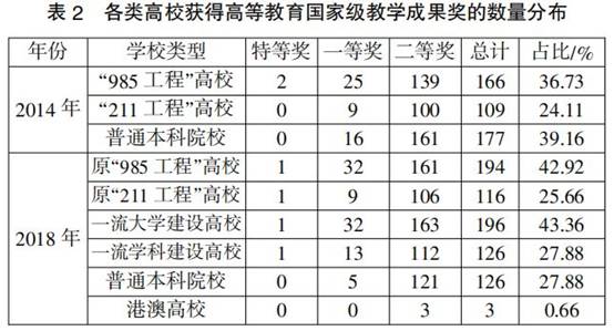 2014年获奖高校共计255所,包括“985工程”和“211工程”高校101所;2018年获奖高校共计220所,比2014年减少了35所。其中,原“985工程”和原“211工程”高校94所,“双一流”建设高校105所。此外,有136所高校连续两届获得高等教育国家级教学成果奖,高水平大学占比超六成。