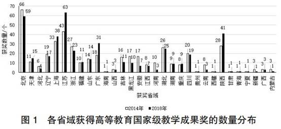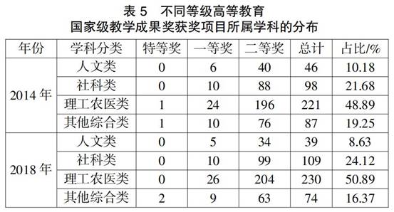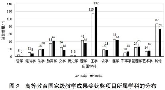 5. 优化学科结构。“学科是大学的细胞,是大学的技术核心领域”,优化学科布局是建设世界一流大学、实现高等教育现代化的应有之义。统计显示,近两届获奖项目所属学科的分布很不均匀,理工农医类居多,哲学、历史学等传统人文学科的获奖数极少。人文社会科学是人类关于世界观、人生观、价值观的生命体悟、理论认识和科学思维,是对社会发展、社会运行和社会管理规律认识和实践的科学。2018年5月4日,教育部高等教育司司长吴岩在教育部产学合作协同育人项目对接会中要求,“全面推进‘新工科、新医科、新农科、新文科’等建设,推出‘卓越拔尖计划’2.0版,形成覆盖全部学科门类的中国特色、世界水平的一流本科专业集群,为2035年建成高等教育强国、实现中国教育现代化提供有力支撑”。因此,笔者建议高等教育国家级教学成果奖评选应在学科之间做适当平衡,缩小人文社科与理工学科获奖项目的数量差距。就省域和高校而言,则要因地制宜、因校制宜,明确发展定位,集中优势资源,打造优势学科专业,彰显办学特色。