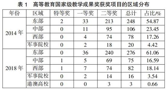 由表1可见,高等教育国家级教学成果奖获奖项目的区域分布不平衡,东部地区占绝对优势。2014年东部地区共获得248个奖项,占奖项总数的54.87%;2018年东部地区共获得276个奖项,占奖项总数的61.06%,比2014年提高了6.19个百分点。2018年中部地区共获得75个奖项,比2014年减少31项;西部地区近两届获奖总数均占奖项总数的18%左右。此外,值得注意的是,2014年两项特等奖集中在东部地区,2018年则分别花落中部与西部地区。