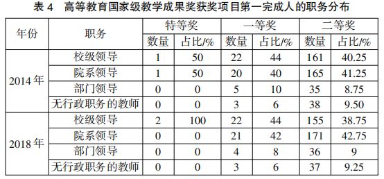 4. 引导教师参与。教师是人才培养的关键,也是高校教学改革的主体,更是兴教之本、立教之源。近两届高等教育国家级教学成果奖评选工作明确要求,“优先奖励长期从事公共课、基础课和实验实践教学的教师,尤其是中青年教师所取得的成果”。统计显示,近两届获奖项目第一完成人九成以上为高校行政领导,这一方面说明高校重视教学改革,另一方面说明一线教师参与不够。为此,笔者建议高等教育国家级教学成果奖评选要秉持“提高教学水平和教育质量”的初心,向扎根教学一线的中青年骨干教师倾斜,至少应适当降低教学工作管理者在第一完成人中的占比。此外,有关部门和高校要从体制机制着眼,围绕“培养人”这一根本任务,正确处理教学与科研的关系,特别是引导教师“回归本分”,潜心教书育人。例如:2014年四川大学为激励本校教师潜心本科教学,设立“卓越教学奖”;2017年清华大学为从体制上鼓励教师更多投入教学,设立“新百年教学成就奖”和“年度教学优秀奖”。