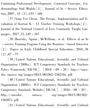 随着信息和通信技术(ICT)的迅猛发展,经济的全球化和国际化不断影响着我们的生活。教育对人类的发展和启示起着至关重要的作用,而教师是教育事业中最重要的推动者和执行者之一[4]。教师的教学质量可以通过教师培训和专业发展来提高[5]。随着信息社会的快速发展,教师需要定期参加培训,更新知识,提高教学质量和专业技能[6]。在职教师培训是提高教师知识、技能和积极信念的良好途径[7],是教师在获得教师资格证书并被聘用到专业岗位后继续接受教育的过程[8],是提升教师知识水平和推动教师专业化发展的关键因素[9] 。国际上很多国家都非常重视在职教师培训,并形成了一些较成熟的培训体系和方法,同时也在不断地摸索和创新[6]。来自不同国家的在职教师培训既有共同的关注点也有各自的特点[8,10],既促进了教师专业化发展,同时也面临一些挑战。
