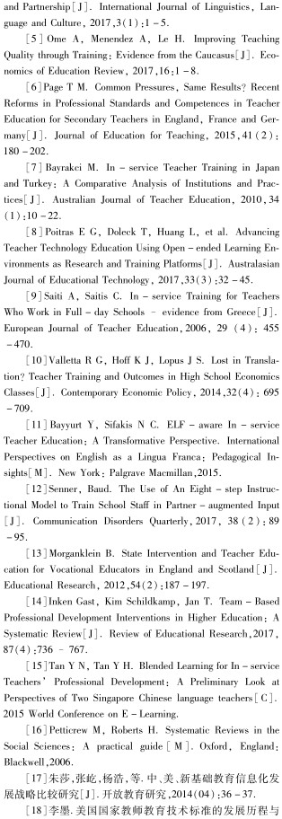 许多学者对各国在职教师培训的实施和评价进行了研究[11-12],对教师培训和教师专业化发展进行了系统回顾和综述,或是基于两、三个国家的在职教师培训进行了个案比较[7,11,13]。Inken对2006年至2015年间国际上高等教育教师专业化发展进行了系统概述[14];Ome等学者分析了2013年至2015年间格鲁吉亚K-12教师培训项目的实施效果[5];Bayrakci从政策和实践层面对日本和土耳其的在职教师培训进行了个案比较分析[7];Tan等以两名新加坡华文教师为个案研究对象,探索混合学习促进在职教师专业化发展的举措和成效[15]。