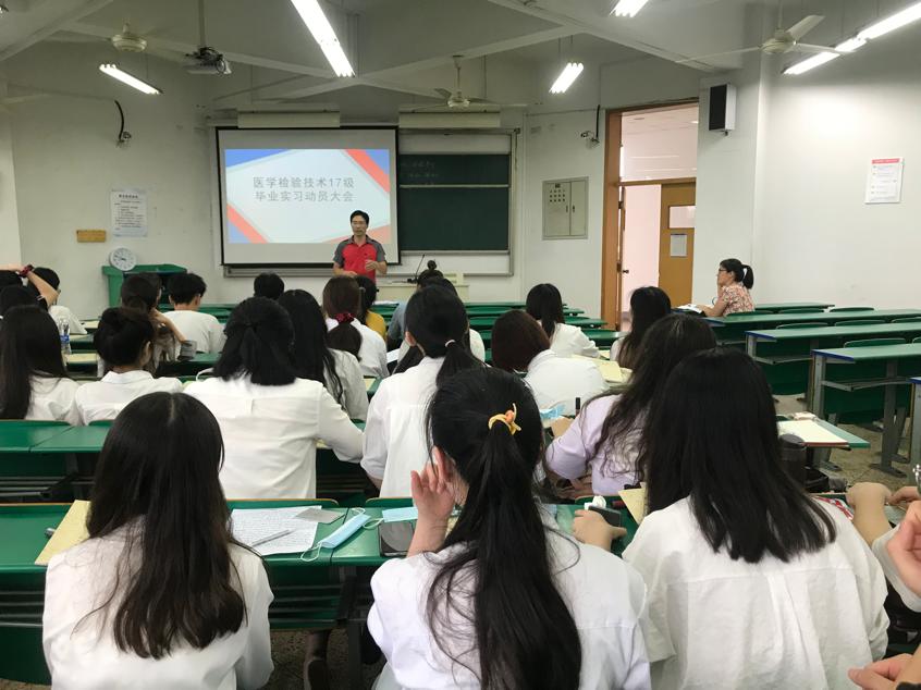医学检验技术专业17级学生即将告别校园,进入毕业实习阶段。为了顺利完成实习任务,确保实习效果,医学检验系于2020年7月7日上午举行了毕业实习动员大会暨“业界精英进课堂”活动,大会由医学检验系副主任刘晓瑜老师主持。