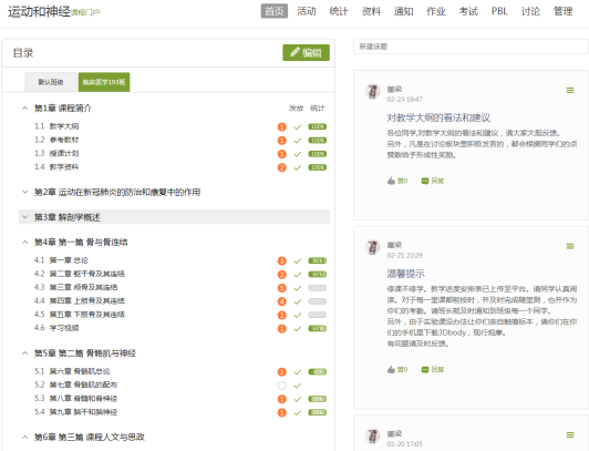 结合当前新冠病毒肺炎肆虐的背景,我在课程章节中设置了“运动在新冠肺炎的防治和康复中的作用”,在该章节中上传在本次防控中的典型事迹,尤其是我校校友的典型事迹,使学生明确自己的使命和担当。另外通过学习运动与神经,明白运动在提升人体免疫能力的作用,另外如何防控运动损伤。