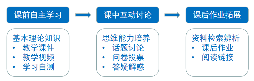 将课程理论知识点录制成教学视频,提前发布,原本课堂中讲授的内容,可以通过在线平台实现学生自主学习。优点在于学生可以在规定时间内自由分配学习时间,无视时间与空间的限制,且完成视频学习后即能进行自测。
