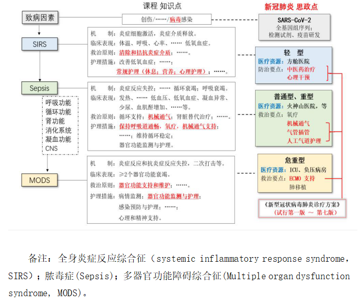 1)SIRS是由于细菌、病毒、创伤等因素作用于机体,导致炎症介质过度释放,引起的全身炎症性损伤综合征。病毒是其中的一种致病因素,由此展开讨论,新型冠状病毒(novel coronavirus,SARS-CoV-2)是否会导致SIRS的发生?作为一种新发现的β属冠状病毒,与SARS同属于冠状病毒,可以导致全身炎症性损伤综合征的发生。其不分节段的单股正链RNA病毒,中国是首个向全球发布病毒全基因组序列的国家,为快速诊断试剂、疫苗研发做出了独特贡献,展现了我国生物科学技术领域的进步和发展。由此指明思政元素“科技兴国”,以及科学技术现代化和国家富强。 2)在SIRS部分知识点中,发热或体温不升、白细胞改变、呼吸增快、低氧血症等症状体征是其主要的临床表现。在此次全民参与的疫情中,作为当事人和护理专业的学生对新冠肺炎的临床特征、防控原则有一定程度的了解,结合课前布置的任务,通过提问、讨论的形式让学生参与教学,教师概括总结。并结合《新型冠状病毒感染的肺炎诊疗方案》展开轻症、重症患者的临床表现,以及医疗资源的配置、方舱医院、中药治疗等此次疫情防控中高频词汇的解惑答疑。 SIRS未能有效控制可发展为Sepsis,出现威胁生命的器官功能障碍,尤其表现是呼吸功能、循环功能的障碍,需要机械通气支持,保持呼吸道通畅、氧疗等。由此知识点引出重症新冠肺炎患者的急性呼吸窘迫综合征表现,肺泡渗出性改变,影响气体交换,可急剧进展为ARDS。接着引导学生拓展知识,如何进行呼吸道传染病患者的机械通气、气道护理。由此引出,党中央统一领导、统一指挥、统一调度的全国一盘棋机制,广大医务人员无私奉献、英勇奋战。全国有346支医疗队共计4.26万人驰援武汉、湖北,接近全国重症医务人员资源的10%的重症专业医务人员负责重症的救治工作。世界卫生组织总干事谭德塞认为,“中方防疫行动速度之快、规模之大,世所罕见,这是中国制度的优势,有关经验值得其他国家借鉴。”这充分体现了社会主义制度的优越性,保证了新冠肺炎病人的应收尽收,应治尽治,充分体现了中国共产党始终把人民利益放在第一位的初心和决心,体现了以人为本的社会主义核心价值观。阐明思政元素“社会责任”。 3)医院的重症病房往往是生与死交锋最激烈的战场,也是救治MODS的主战场。MODS的救治包括器官功能支持和维护;器官功能监测与护理,包括循环系统、呼吸系统、肾功能、肝功能的监护和支持等,部分患者会使用持续肾脏替代治疗(CRRT)、体外膜肺(ECMO)。在新冠肺炎的救治中,并指出在党和政府始终把人民群众生命安全和身体健康放在第一位,要全力救治患者。全国支援武汉不光集结了急危重的专家和精英,也配置了大量重症救治的仪器设备,其中ECMO近400台,有效地提高了抢救成功率。高传染性是新冠病毒的特点,在ICU中医护人员克服种种困难,直面危险、不顾自我冲在抗疫战争的第一线,涌现出了一大批新冠肺炎疫情防控战中的典型人物、感人故事和优秀事迹,结合思政案例三阐明思政元素“职业道德”,以及爱岗敬业。 2.课前—课堂—课后延伸拓展 1)课前阶段 教师导学,布置本节学习任务,引导学生课前自主学习,完成教材和文献资料的学习,以及相关的生理病理知识学习。布置任务。学生收集资料,关于新冠肺炎的临床特征、防控原则,以及疫情防控中感人的人和事。用于课堂讨论和分享。 2)课堂教学 课堂导入。通过提问学生,课前测试检查自主学习效果。在重点、难点精讲环节中,通过知识点、思政点的交互偶联思政元素。并将新冠肺炎危重型患者救治中,心肺功能支持的重要手段ECMO,作为知识关联和拓展开展教学。 3)课后学习 提供新冠肺炎案例资料,《重症——新闻调查》视频资料进行课后小组讨论分析,加深学生对知识的理解和应用,培养学生沟通协作和团队合作精神。