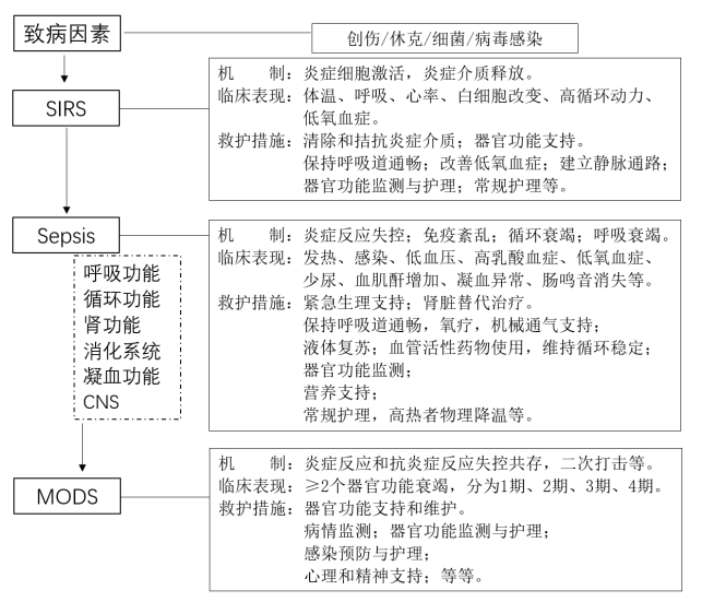 【课程基本情况】 课程名称:急危重症护理学 授课章节:第十四章 多器官功能障碍 授课教师:赵伟英 课程类型:专业平台课程 教学班级及人数:护理学171班、172班 课程特点:线上教学【教学目标】 1.知识目标:能准确说出全身炎症反应综合征、脓毒症和多器官功能障碍综合征的概念、临床表现;能解释全身炎症反应综合征发病机制和脓毒症发病机制之间的联系;能解释全身炎症反应综合征、脓毒症和多器官功能障碍综合征的护理要点。 2.能力目标:能制定全身炎症反应综合征、脓毒症和多器官功能障碍综合征患者的监测、护理方案并能正确实施。 3.素质目标:尊重关爱生命,树立正确的专业价值观和职业道德,爱岗敬业,具有社会责任意识。具有严谨、慎独的工作作风,具有严肃的科学精神。【教学内容】 在创伤、感染、休克等损伤因素打击下机体产生应激反应,导致多种炎症介质产生和过度释放,引起全身炎症反应综合征。若原发病和继发于炎症介质所引起的病理生理改变得不到控制和终止,就会导致远隔原发病灶的器官发生功能损害甚至衰竭,表现为脓毒症、多器官功能障碍综合征。