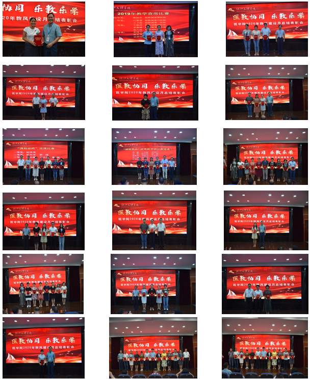 在表彰阶段,学院领导及郑黎明先生分别为2019年教学标兵、2019年教学查房比赛获奖选手、2019年度课堂教学“示范课教师”,首届“课程思政”说课比赛、“课程思政”优秀教学设计、“课程育人”优秀教学案例,主题微党课、2020年度青年教师教学竞赛获奖选手颁奖和首届“教坛新秀”颁奖并合影。