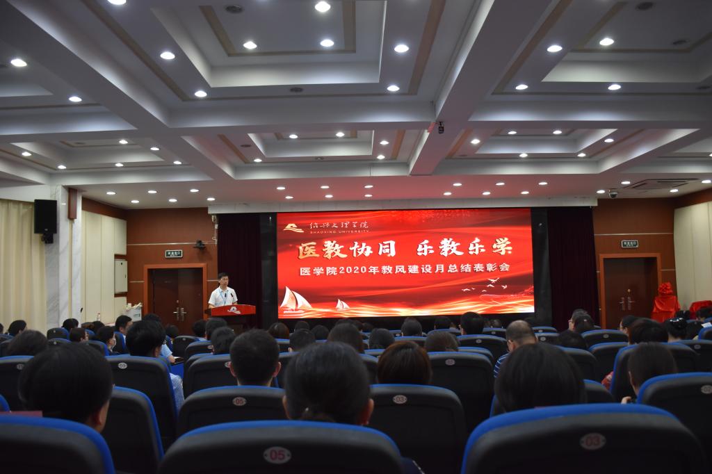 新昌“郑氏奖教金”设立者郑黎明发表讲话,院党委委员、教研科科长马国庆做教风建设月活动作总结报告。