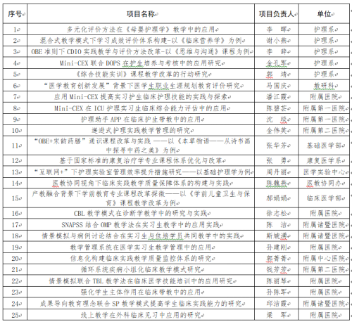 近期,学校先后公布2021年度校级教学改革研究项目立项名单,全校共计立项60个,我院获批25个,期中10个为医学教育教学改革专项、10个为附属医院专项、1个为教学管理专项、4个为课改立项。(教研科 马国庆)