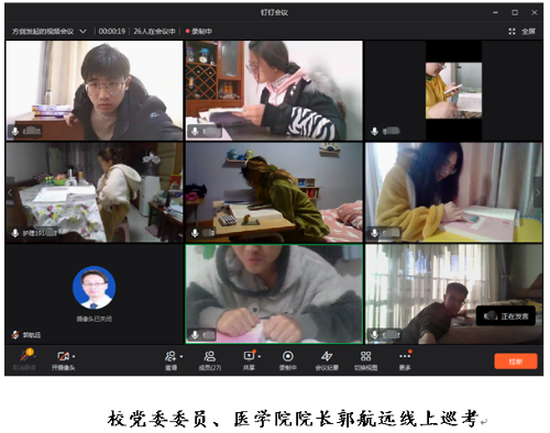 这是《预防医学B》课程线上考试的线上考试现场,也是本学期学院线上考核的第17场考试,考试在紧张而有序节奏中稳步进行。1月4日,校党委委员、开云最新官方院长郭航远,开云最新官方党委书记夏瑞明先后进入教研科钉钉视频监控平台,进行巡考。