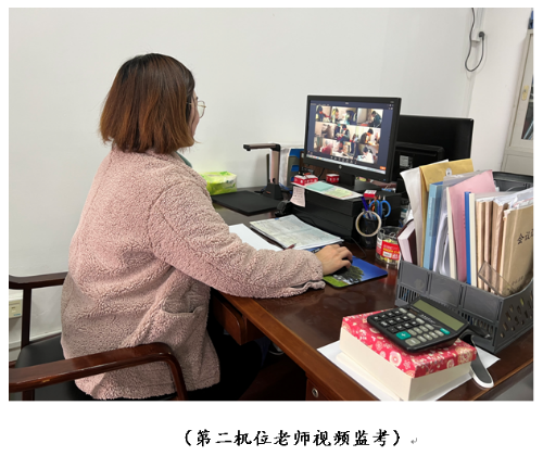 “老师,能看到我吗?我的电脑这样放置可以吗?”1月4日下午13时30分,临床医学(卓越医师)193班陈卓能同学进入钉钉平台视频会议,在第二机位监考老师张华芳指导下不断调试监控自己考试环境的电脑摄像头角度;14时25分,陈卓能同学进入超星学习通平台,点开考试通知、阅读考试注意事项、进行人脸识别验证;14时30分,考试正式开始,第一机位监考教师邢海燕通过电脑屏幕,在学习通后台认真比对考生考试信息,时刻关注线上考试考场动态。