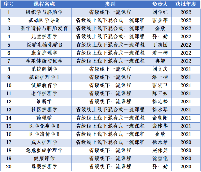 截至目前,学院共有省级一流课程20门。学院将在坚持“两性一度”、全面实施建设“金课”计划的基础上,全面强化价值引领、丰富形式载体、创新方法手段,不断孵化“双万计划”的省级、国家级一流课程,全力打造符合时代发展、融入“新医科”基因、强化示范引领的金牌课程。