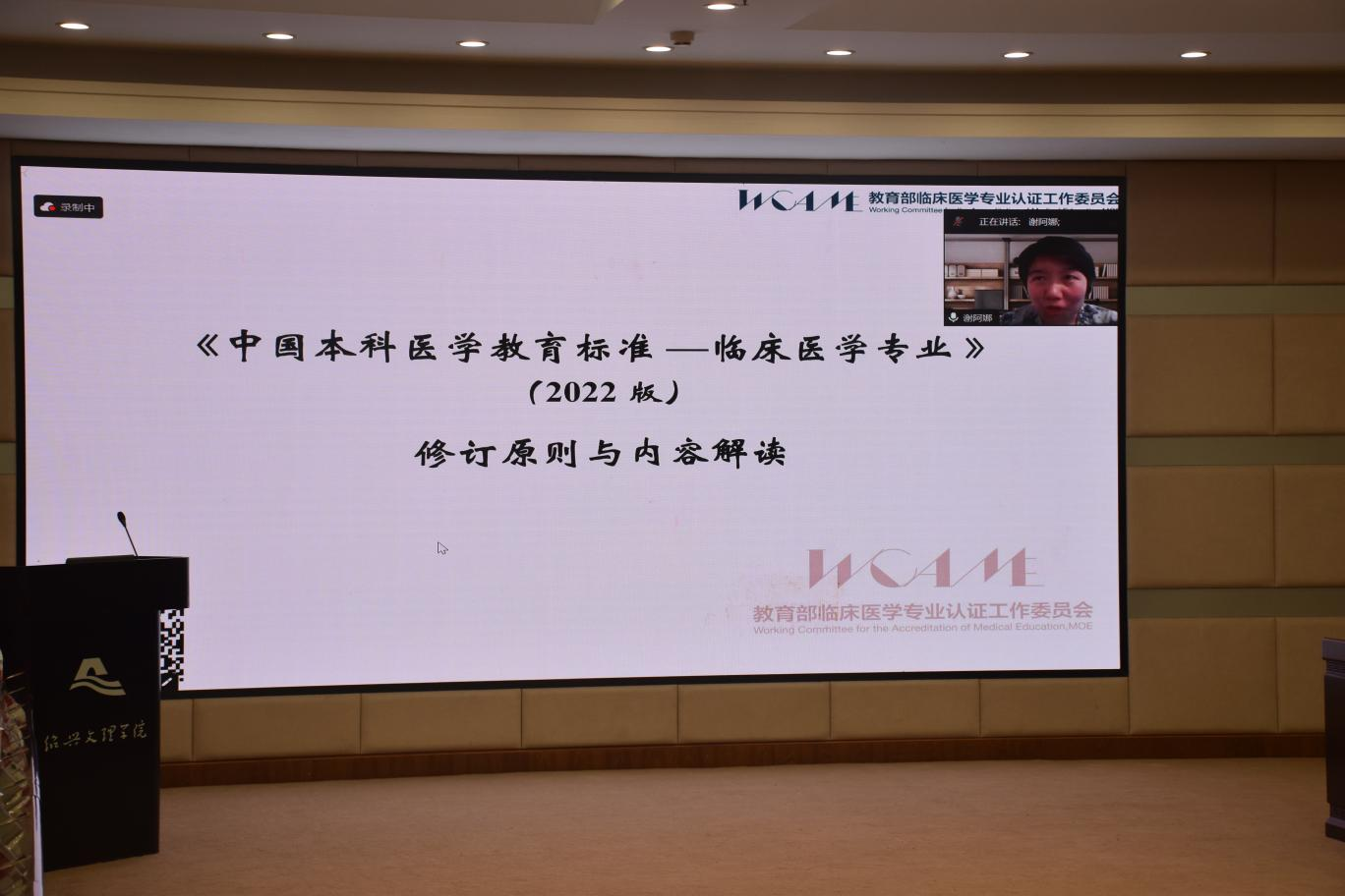 教育部临床医学认证专家谢阿娜作《中国本科医学教育标准—临床医学专业》(2022版)修订原则与内容解读的专题报告。(院办公室)