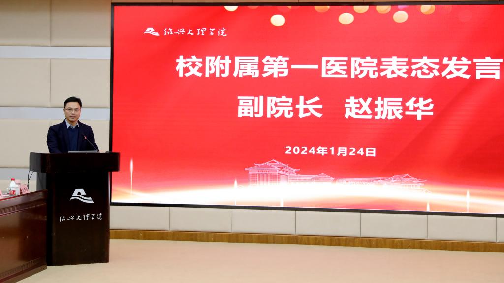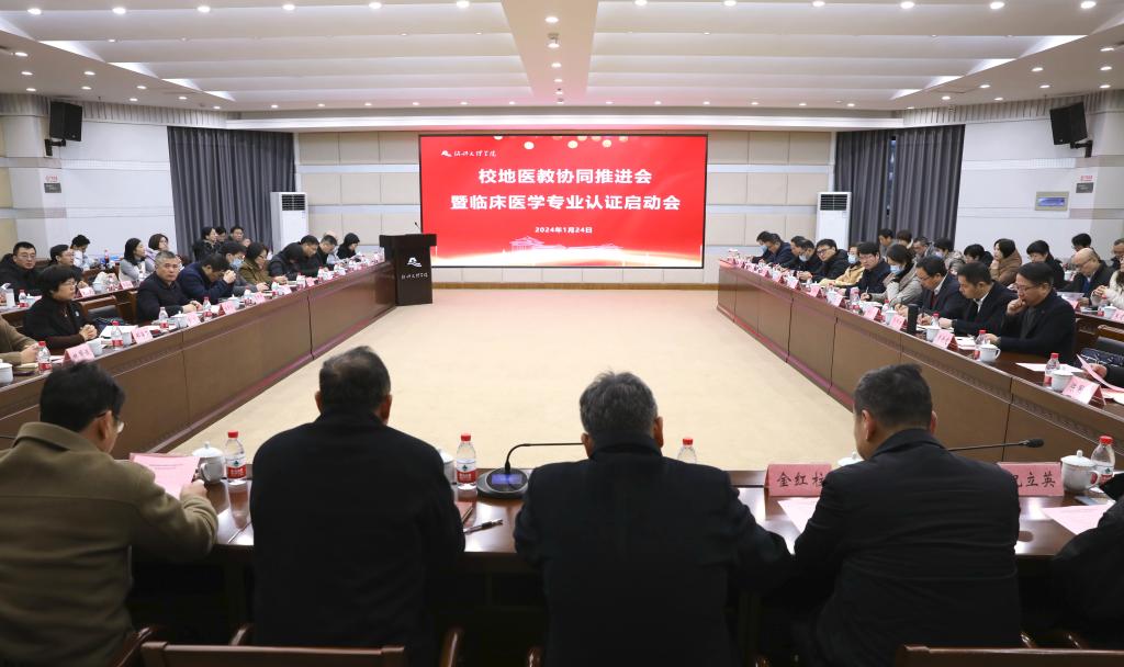 1月24日,校地医教协同推进会暨临床医学专业认证启动会在河西校区图书馆一楼报告厅举行。学校副校长柳国庆,绍兴市卫健委党委书记、主任王宏达,绍兴市卫健委副主任金红柱、学校教务处处长方小利、学校教育质量评估中心主任祝立英,绍兴市卫健委相关职能处室负责人、学校相关职能部门负责人,各附属医院主要领导、科教处(科)负责人,各社区卫生服务中心主要领导、科教科负责人,开云最新官方党政领导班子成员、科室、系(部)、中心负责人,临床医学部全体教师参加会议。会议由开云最新官方党委书记吴剑平主持。