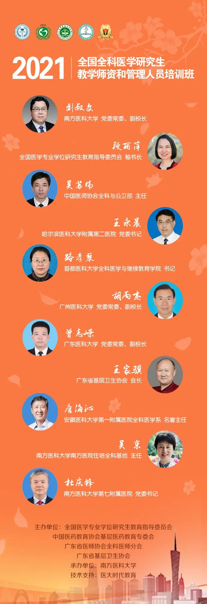 为提高全科医学研究生培养质量,加强全科医学研究生导师队伍建设,提升全科医学师资带教能力和水平,受国务院学位委员会办公室委托,全国医学专业学位研究生教育指导委员会会同中国医药教育协会基层医药教育专委会、广东省医师协会全科医师分会、广东省基层卫生协会定于2021年12月18日举办2021年度全国全科医学研究生教学师资和管理人员线上培训班。