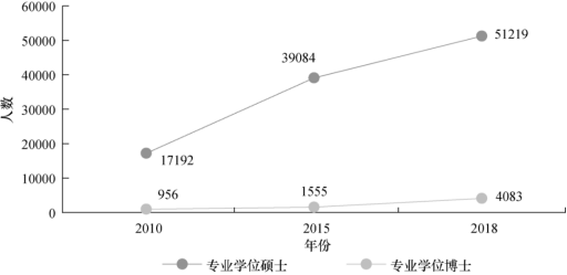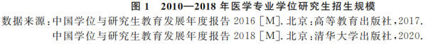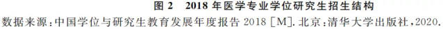 规模与结构。2010-2018年,我国医学专业学位研究生招生规模持续扩大,与2010年相比,2018年医学专业学位硕士招生人数增加3.4万人,医学专业学位博士招生人数增加0.3万人(图1)。与医学专业学位硕士规模相比,医学专业学位博士培养规模较小。